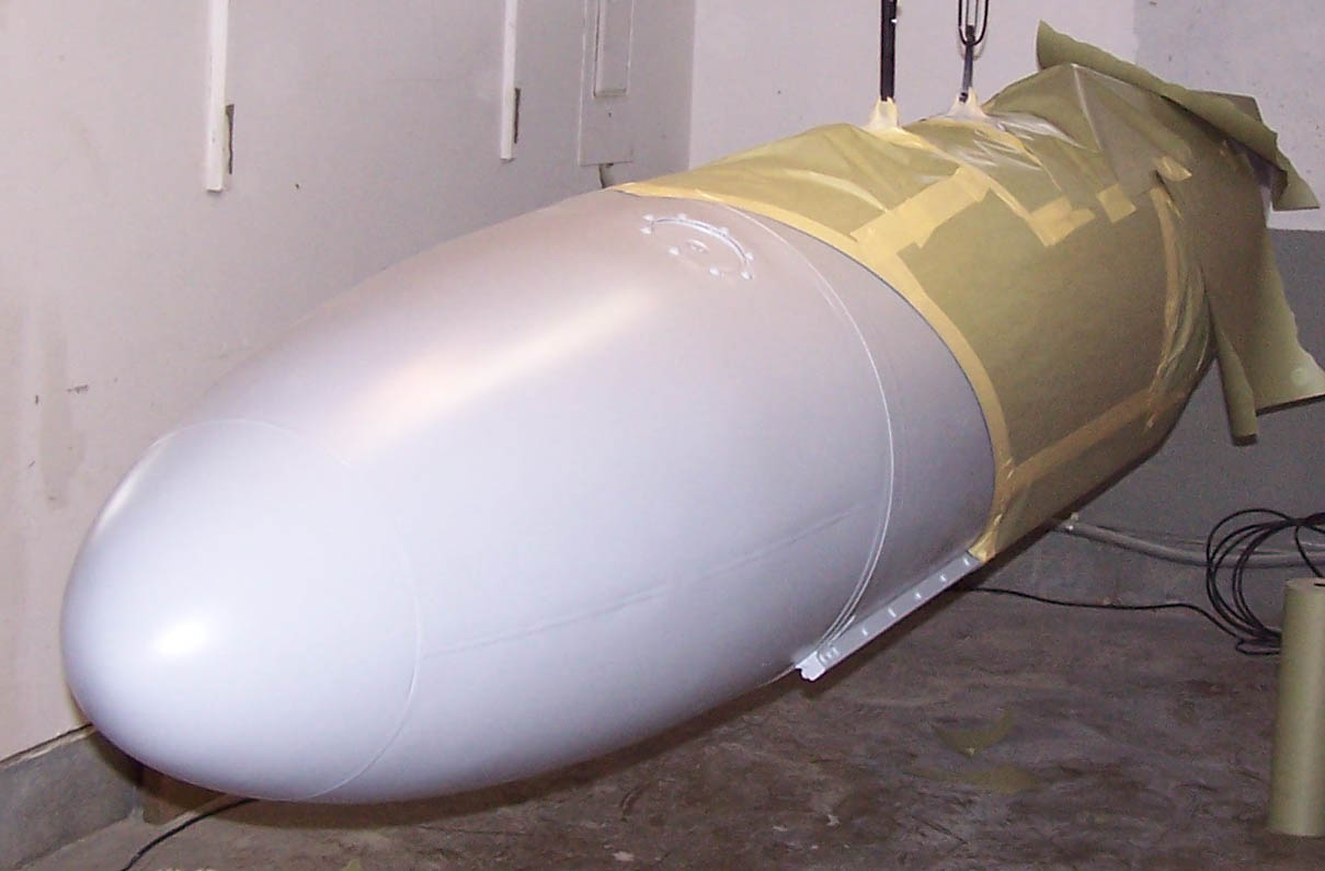 Cell 3 shows the initial taping. Because final red/yellow/blue paint scheme requires diagonal segments, each tape segment follows a compound curve along the tank surface. Therefore, I had to get (very expensive) flexible tape from an automotive paint shop. (Regular painter's tape will wrinkle when you stretch it across a compound surface, thus producing less than clean lines along the diagonal.) Applying the tape was a real adventure ... I spent several hours measuring, taping, remeasuring, and retaping. Doing the bottom segment meant lying on my back and working up ... my old neck discovered that my head weighs a lot after an hour or so. (Incidentally, Mike took pity on me after I had finished the taping ... he applied the wax paper to protect the middle and tail sections from overspray.)