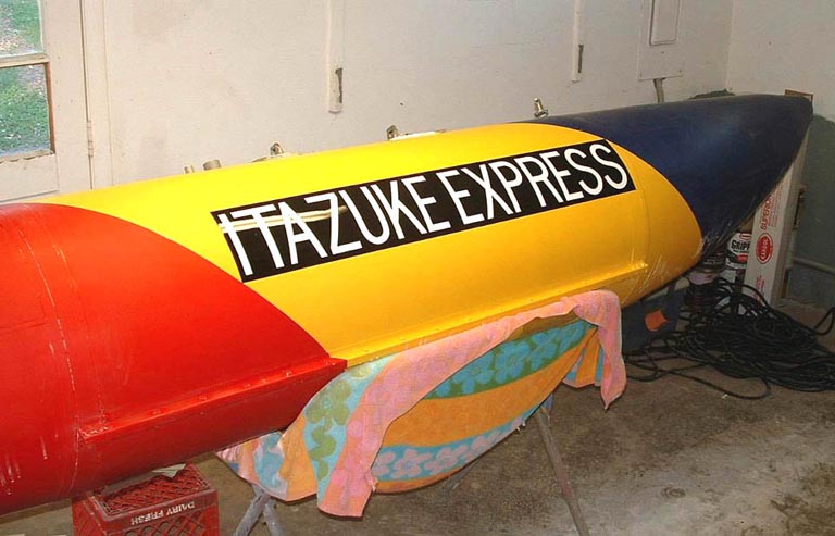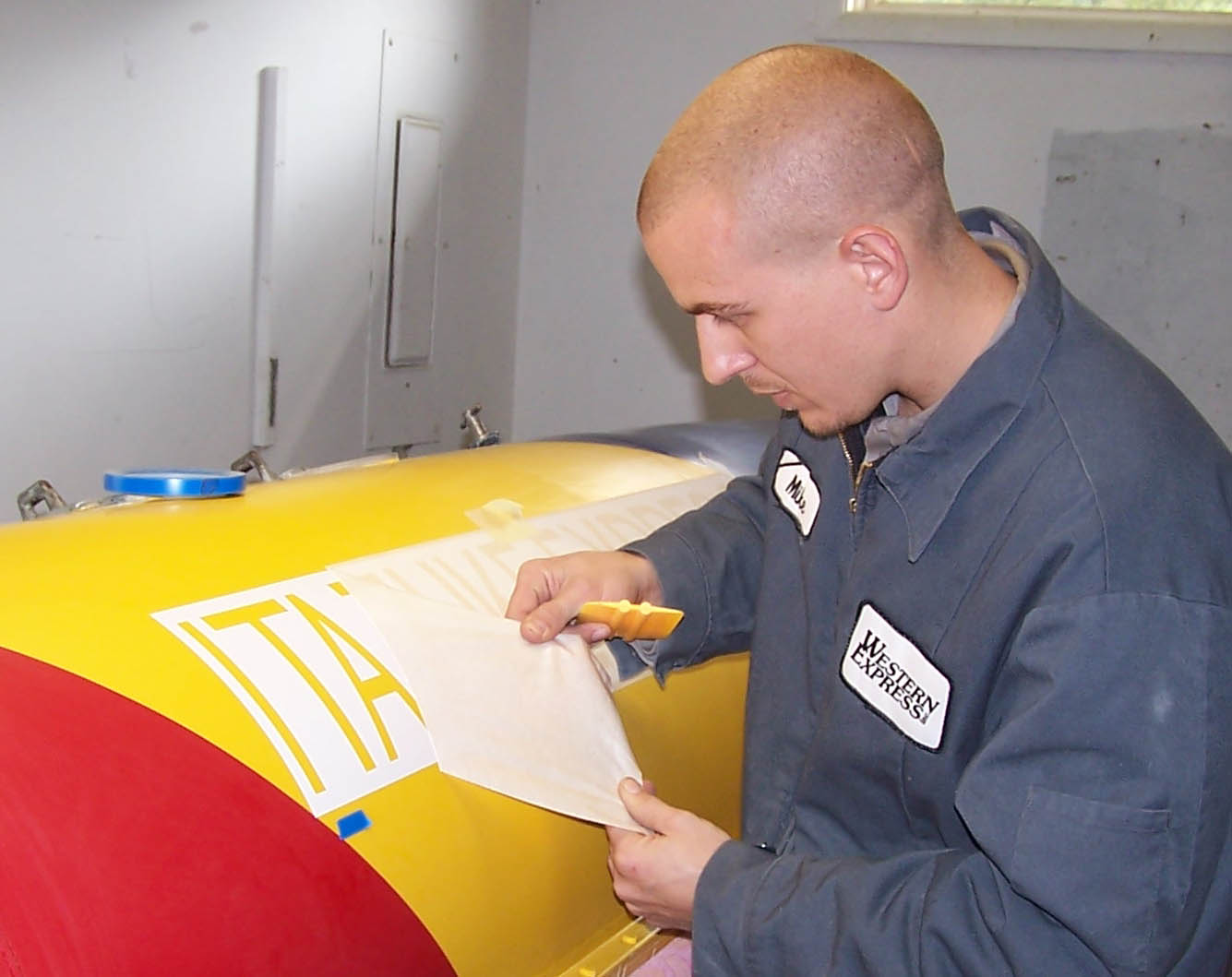 Figure 7 shows the completed letter box in Cell 1. As you can see, the stencil produced the correct font and spacing for the Itazuke Express label. Note that there is still some white residue on the red, yellow, and blue sections. This residue was left after the wet-sanding of the clearcoat was done.