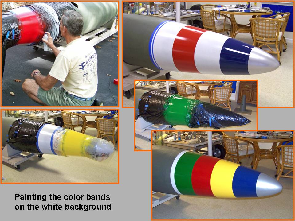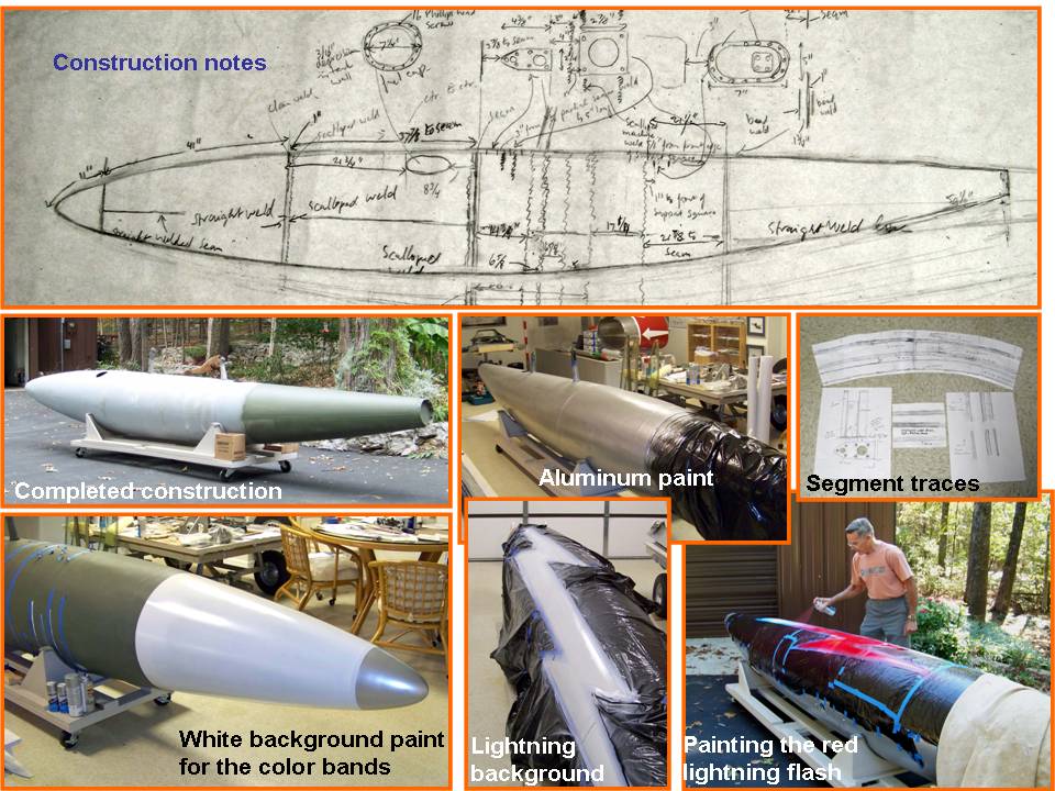 Using a set of composite pictures, Figure 5 documents the completion of the building, painting, and displaying steps. Cell 01 shows the original work sketch, the first roll-out of the completed tank, and the start of the complex painting process. (The color bands and the red lightning bolt look a lot better if the color is painted over a solid white background.) Cell 02 documents the completion of the painting process, while cell 03 shows the display in the F-100 Building. (And, yes, that inset picture in cell 03 shows the much simpler paint job on the first 275-gallon tank that was completed a year earlier. That tank, too, is hanging in the F-100 Building.)