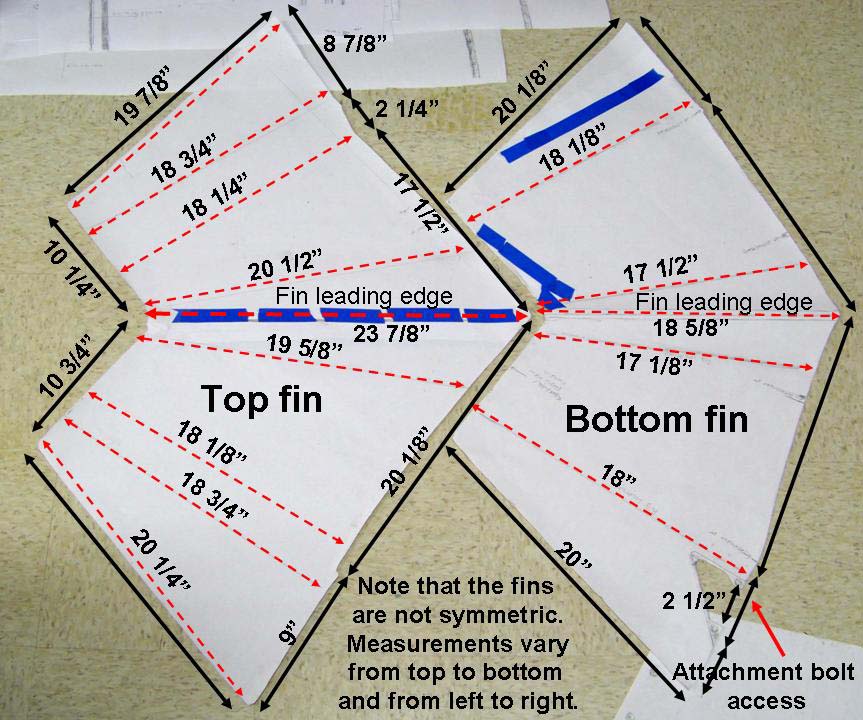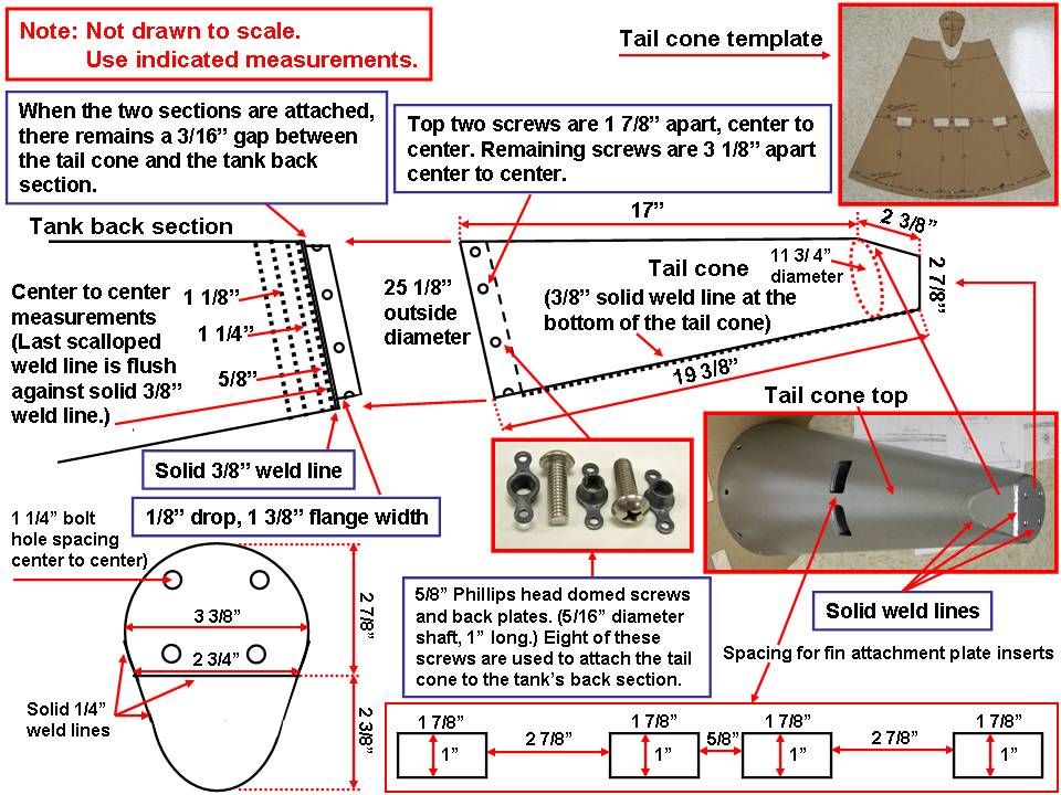 After all four tank fins passed our "quality control" check, I sanded the aluminum with an 800-grit paper to promote better adhesion of a self-etching primer. After spraying the self-etching primer on the surfaces, I sanded the primer lightly, then sprayed a gray primer-filler over that sanded surface. Next, the primer-filler was wet-sanded to produce a really smooth surface that would receive the color coats that would be applied later. Figure 2, cell 01 shows the primer-filler-coated fins. In the meantime, the tank tail cone was made to receive the fins. Cell 02 shows the paper tail cone tracing, the cardboard template, and the completed tail cone. Cell 03 shows the fins attached to the tail cone. (I painted those fins during the breaks in hardware production.)