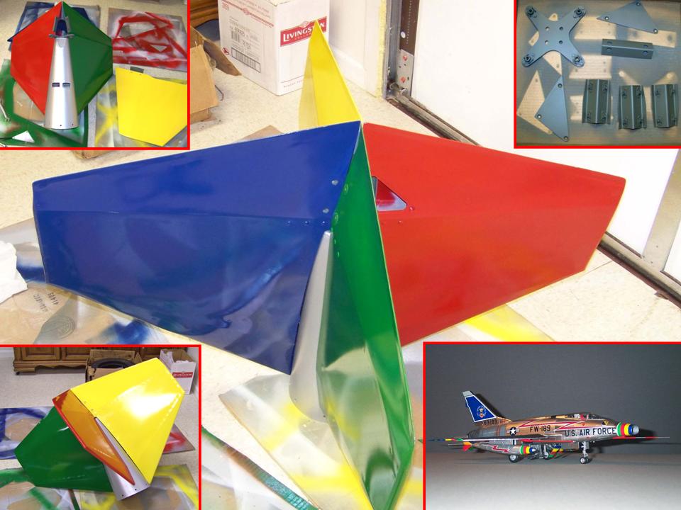 Incidentally, the composite picture in Figure 2, cell 03 shows several views of the tank fins attached to the tank cone, plus a view of some fin attachment back plates. The lower right-hand corner shows a picture of a 1/48-scale model I built and painted in the colors of 56-3189, 309 FBS, 31 FBW, based at George AFB in 1958. This aircraft was flown by Capt. Walt Bruce during the 1958 TAC gun meet. The brightly-painted 275-gallon tanks on 56-3189 became the painting guide for the paint job you will see documented on this web page.