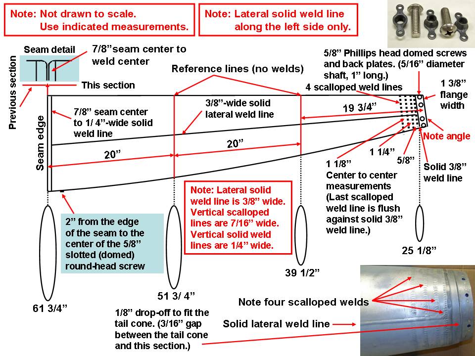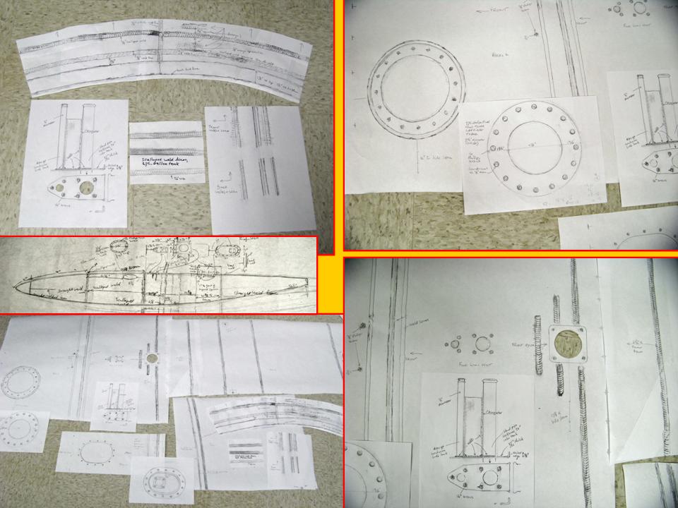 The completion of the tank fins and cone -- a task that consumed four months -- let us switch our attention to the tank itself. To document the work, I transformed the many tracings to a set of work drawings. Figure 3, cell 01, shows a small portion of the collection of tracings. (Note that the left middle panel shows a large sketch of the complete tank.) Cells 02 and 03 show the transformation of the tracings into the work drawings that became the basis for the tank templates.