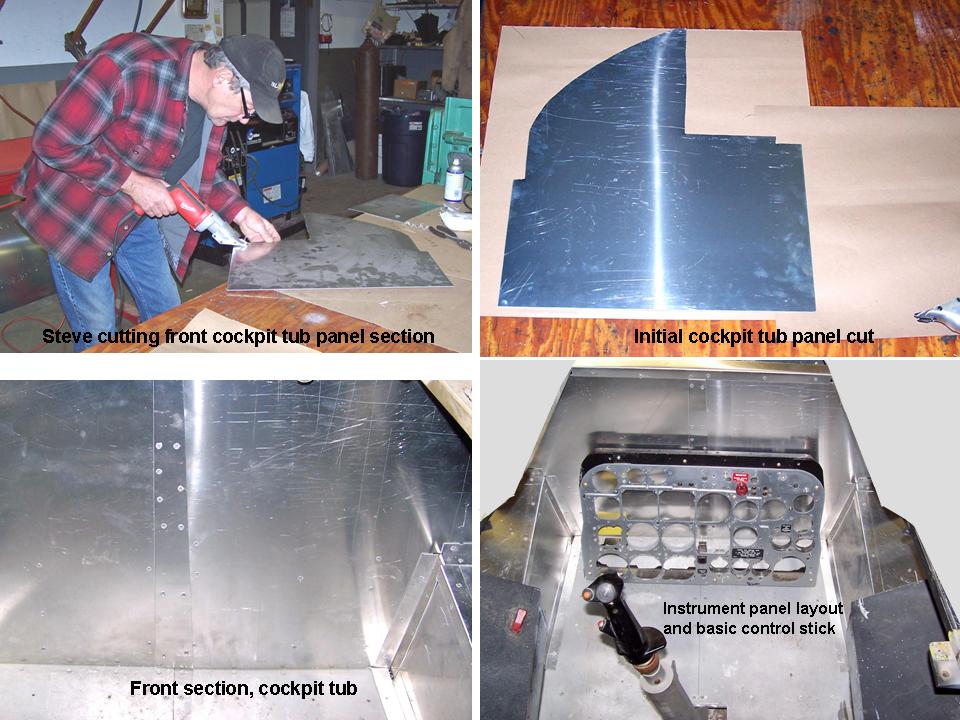 After getting a good "feel" for the cockpit layout through the modeling work, I traced the major components on the aluminum sheet. Figure 1, cell 02, shows Steve cutting the first cockpit tub panel, the completed panel, and the completed bottom front section of the cockpit tub. The lower right-hand corner of the picture shows the basic tub layout ... and the new instrument panel frame that will become the base for the flight- and engine-instrument installation.