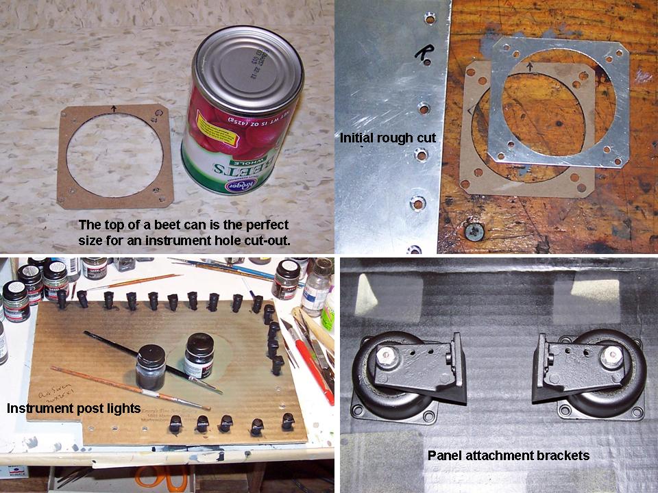 Figure 4, cell 02 illustrates why I spent so much time on the instrument panel. Fortunately, the top of a beet can is just the right size to serve as a template marker. (The text in this composite picture describes the action.) Cell 03 shows the result of many months of work ... the next step will be to install the intrument panel in the cockpit tub.