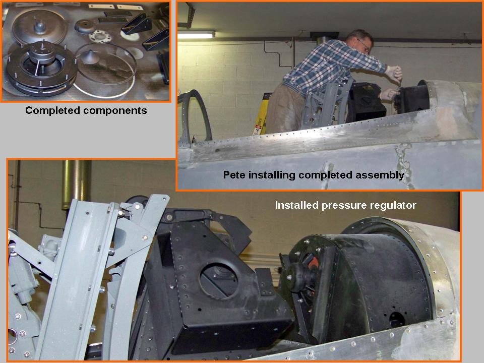 Note by Pete Felts: Pilots often complained about the pressure regulator's apparent malfunctions, so it was often on the "write-up" list. Actually, that unit worked quite well ... but pilots often put coats, cases, and personal items in back of the canopy, thus blocking it off and hindering its function. Simple advice: don't put stuff in the back of the canopy "shelf."