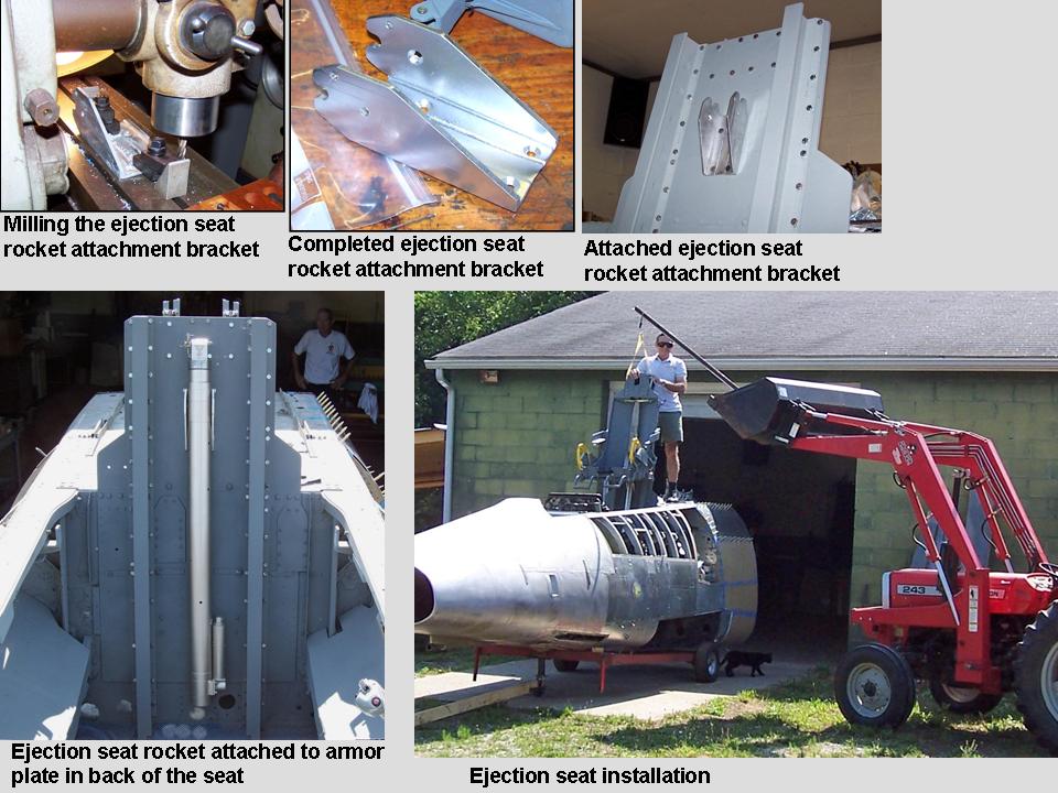 The ejection seat you see in this set of pictures is a lot lighter than the real seat would have been. For example, I continue to operate on the principle that "if you can't see it, it doesn't need to be there." In addition, many of the parts I used are much lighter than the originals. (For example, a motor assembly made of a set of telescoping cans is a LOT lighter than the original!) It would have been possible to lift the seat by hand -- that's how I got it into my van -- but it's a lot easier to use a tractor's front-end loader to lift the ejection seat into the cockpit. Fortunately, Steve has access to such equipment and, more important, knows how to use it. As you can tell by looking at the picture in cell 02, Steve had rigged a piece of angle iron to the front-end loader to facilitate the lifting of the ejection seat. All I needed to do was guide the hanging seat into the cockpit rails and then let gravity do most of the work. (My home-made rollers needed just a bit of fine-tuning, but the insertion of a few washers lined them up perfectly to roll the seat in place.