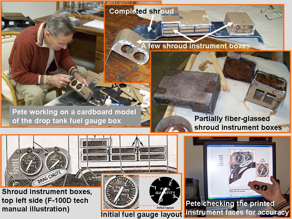 The composite picture in Figure 5, cell 02, shows the work done to make the instrument panel shroud. Cell 03 documents the work done on the instrument boxes that are attached to the instrument panel shroud. Note that the F-100D tech manual illustration provided the blueprint for the instrument boxes. (I modeled the drop tank fuel gauges in Microsoft Powerpoint, then saved the slides as .jpg files that would be printed to become the instrument faces.) Figure 5, cell 04, documents the same process that was used to make the gun sight. Cell 05 shows the completion of the instrument boxes that are located on top of the shroud. The completed gunsight will be shown in cell 06.