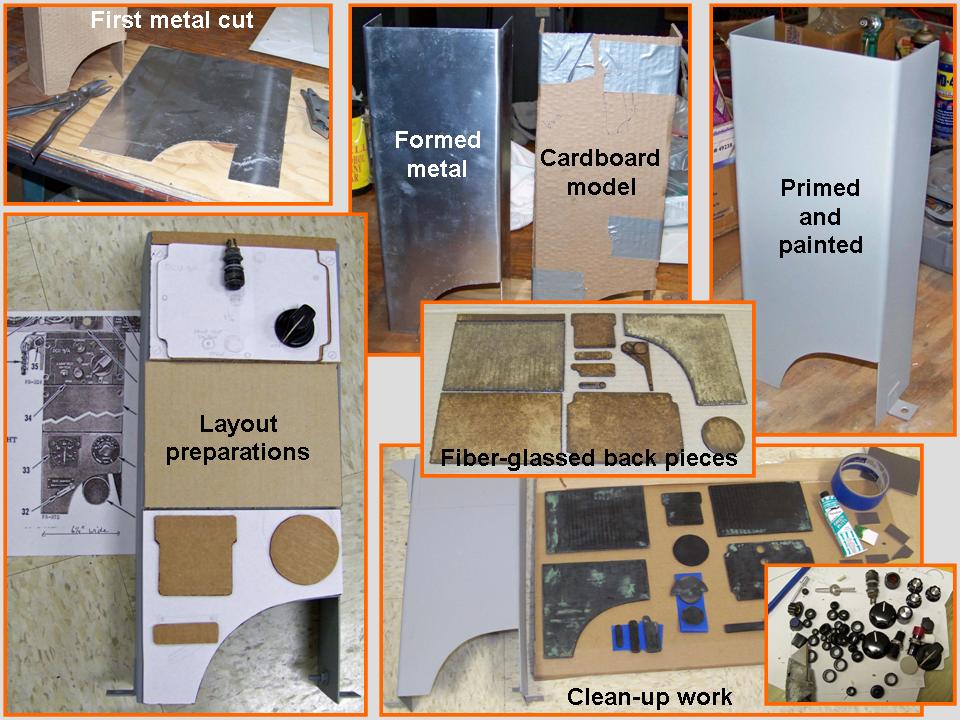 Figure 1, cell 02, shows the process that yielded the partially-completed center pedestal. Note that the "production" procedures used the now-perfected sequence ... from paper tracings to cardboard templates to metal. Instrument back plates were made from cardboard covered with fiberglass resin that was painted black after extensive sanding. You can make a good switch from a long-shanked rivet and various electronics shops are great sources for knobs and buttons. (If a specific shape was needed, I cobbled various components together -- cardboard cut-outs, small washers, wood carvings, and so on. The tops of small clear-plastic round containers became instrument faces and the "instruments" were printed from Powerpoint drawings. The tops of Dremel tool accessory boxes became "push to test" buttons, and so on. (A little imagination goes a long way!)