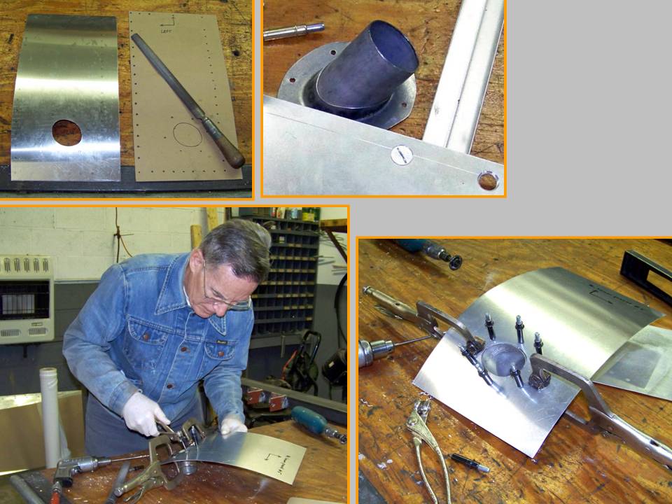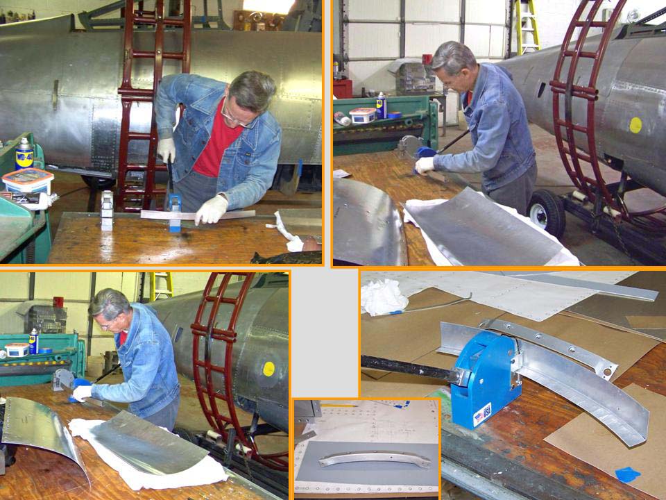 The roll cage worked fine, but there still was a lot of work to be done on the fuselage sides. The composite picture in Figure 3, cell 03 shows the really fine -- hand-powered! -- bending and stretching tools that we used to make the internal frames for the side panels you see on the table. Note also that the cleco "forest" you can see on the panel below the cockpit in Figure 2, cell 03, has been replaced by rivets ... the result of many hours' worth of effort. (During that process, I managed to slip off the roll cage and hit the concrete floor. Amazingly, no bones were broken, but I did manage to add to the collection cuts and bruises that I have collected over several years' worth of F-100 work ... As I used to tell my son, "if you're going to be stupid, you'd better be tough!")
