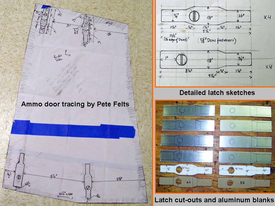 Next, it was time to work on the ammo door panel. I had already completed the frame to match the tracing done by Pete Felts. Figure 5, cell 03, shows the tracing and my detailed sketch of the latches, as well as the latch blanks I cut.