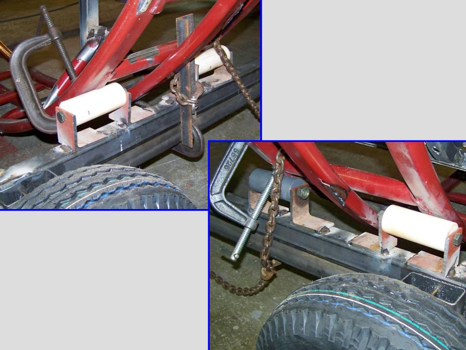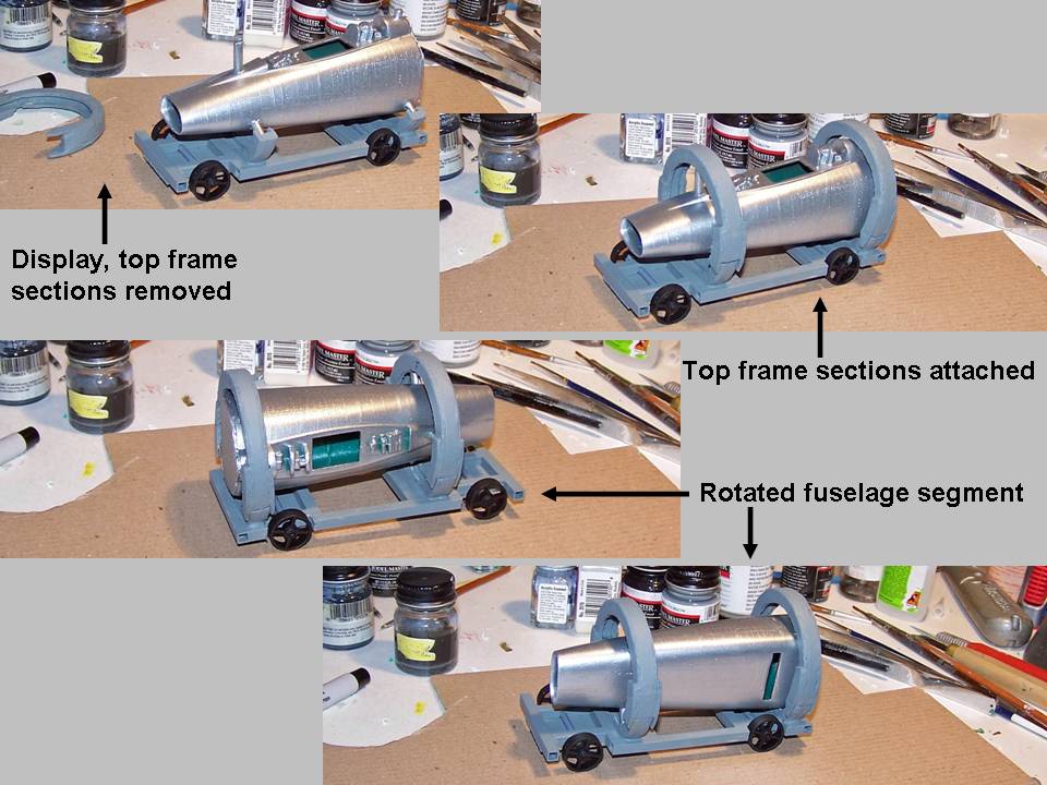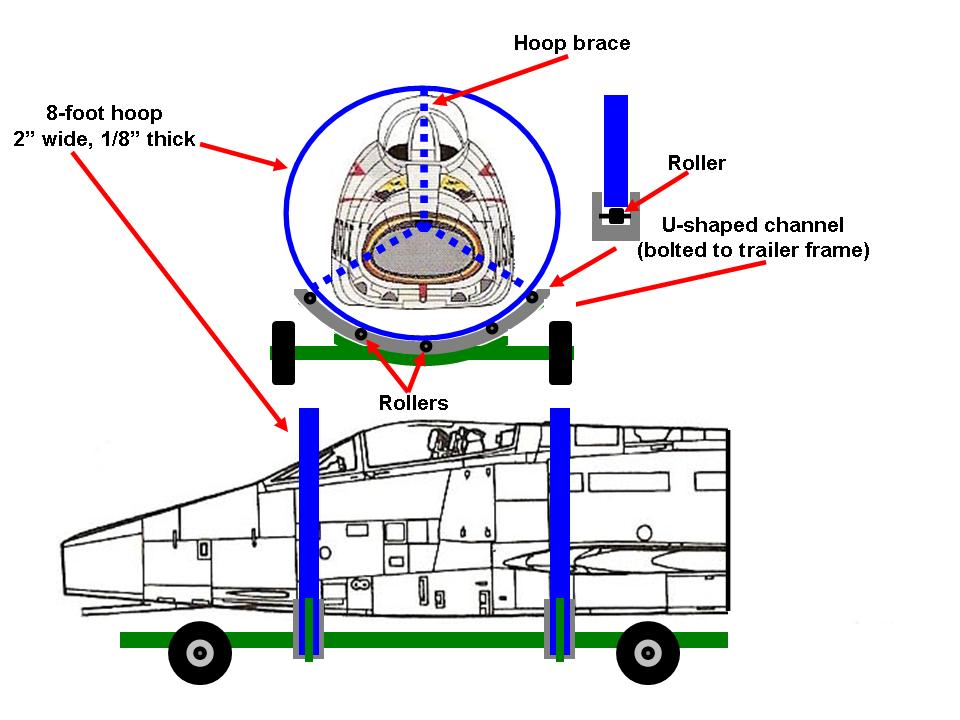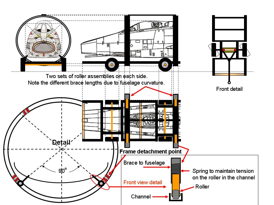 Figure 1, cell 01 shows the initial rotating frame design. Basically, my design required a set of U-shaped steel hoops to be built into the trailer frame. The fuselage would have three 2" box steel supports, placed evenly at 120 degrees to distribute the weight evenly. Each support would have spring-loaded steel roller at its end and the steel rollers would fit into the channels formed by the U-shaped steel frame. Cell 02 shows the test model, which worked fine.