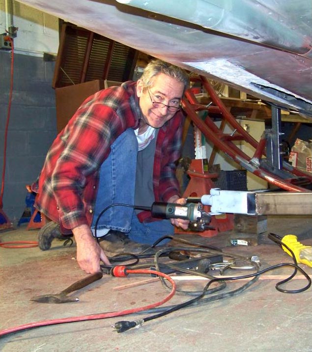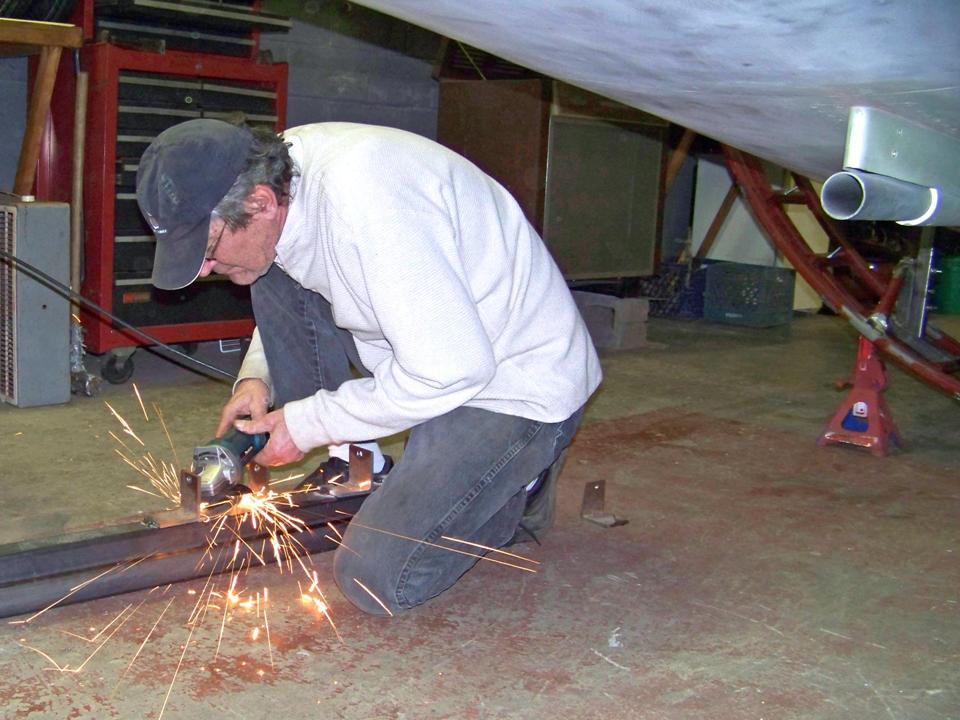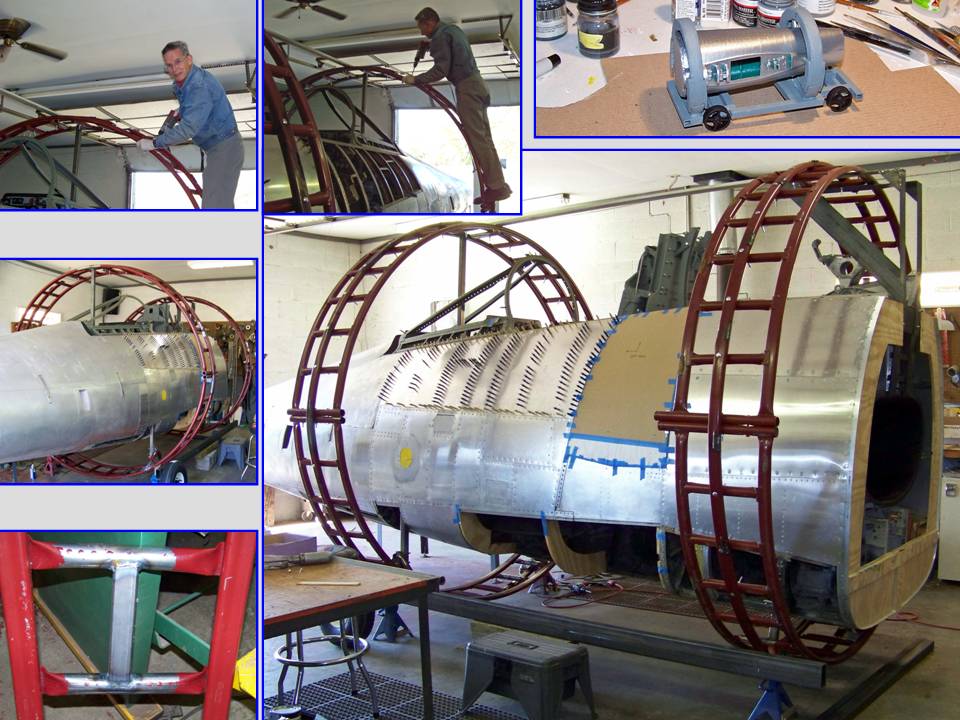 The trailer on which the fuselage was placed to facilitate movement -- and on which the fuselage will be displayed in my F-100 "museum" -- turned out to be a work in progress, too. For one thing, the frame was judged to be too wide, so the frame had to be modified. Also, since we decided that the rollers would become a permanent frame fixture, Steve wanted to improve the roller frames to make them more presentable. Figure 4, cell 03, shows Steve working on the frame modifications. Never a dull moment ... (Note the pitot boom attachment point in the upper right-hand corner.)