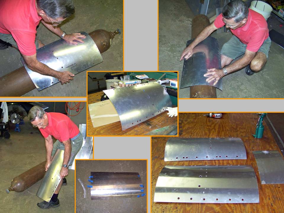There is absolutely no way that building a really large-scale "model" of the F-100 can ever become routine. There are so many different components to build and to put together ... and so many challenges to overcome. Learning to adapt "manufacturing" techniques to the available materials and tools is always an interesting exercise. For example, Figure 4, cell 01 illustrates how an empty acetylene tank can be used to help produce a properly curved lower panel. If the panel curves in multiple directions, you merely move the panel to a different diagonal and continue bending the aluminum along the new plane. As you can tell by looking at the composite picture, final adjustments may take a bit of bending across a thigh or a knee. Cell 02 shows the partially completed panels attached to the frame with clecos. (Note the use of plywood to make some of the formers ...)