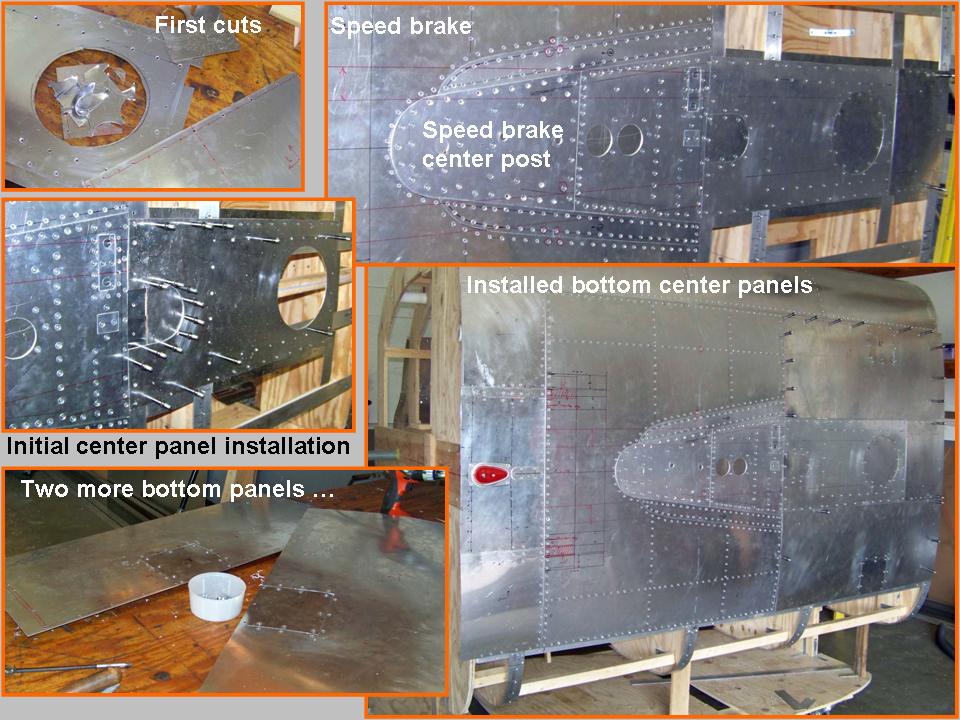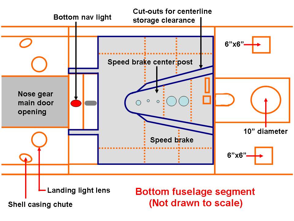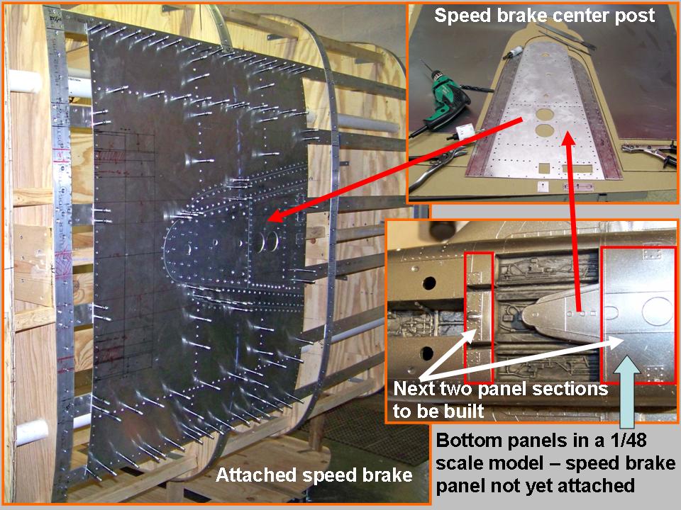 We decided to wait until the canopy was in place before attaching the new fuselage section to the now-completed front fuselage section. (You can check the Fuselage (Part 7) web page to see the completion of that front section.) In the meantime, we could start putting the aluminum components on the bottom of the new aft-of-cockpit section. I had already completed much of the dive brake section, so that would be a logical place to start.