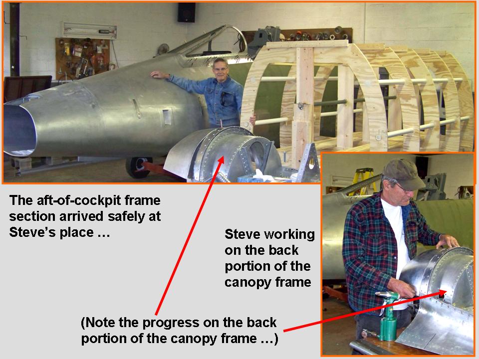 The next major step in the F-100D fuselage manufacture was to transport the new aft-of-cockpit section from my F-100 "museum" where I had constructed it to Steve's place. After that task was completed, we could begin attaching the 1/8-inch thick, 2-inch wide aluminum strips to the plywood frame. The new skin plates could then be attached to these aluminim strips. In the meantime, the canopy had to be completed and attached to the cockpit section. (Without the canopy in place -- and in the closed position -- I did not know the precise curvature and placement of the spine panel directly aft of the canopy.)