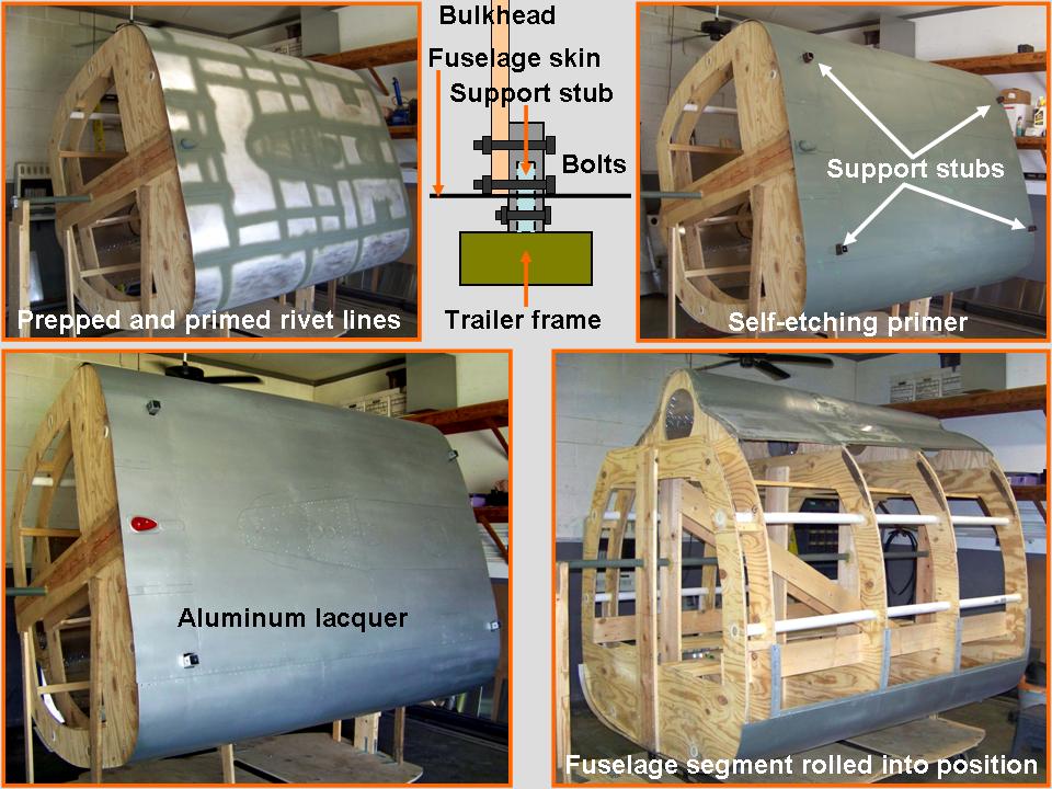 When the new bottom section skin panels were all in place and properly prepared, it was time to spray the panel lines with self-etching lacquer and to perform a final check to see if the Bondo work had yielded the desired results. In the meantime, we had installed four steel support stubs. These stubs will later be used to anchor this fuselage segment to the trailer extension. In turn, that trailer extension will be attached to the main trailer ... proper alignment will ensure that this fuselage segment will fit the fuselage section in front of it.