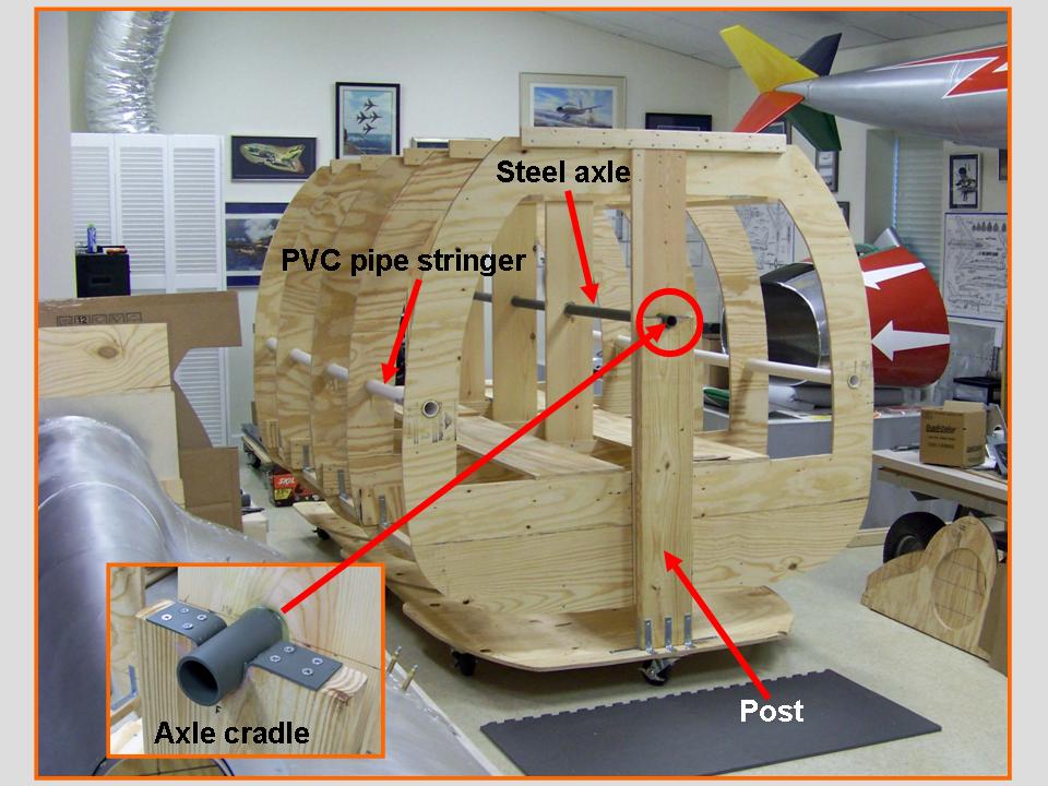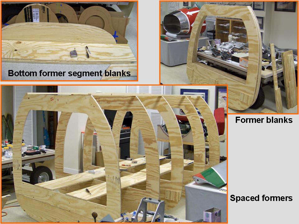 The first job was to make the fuselage "skeleton" to which the aluminum skin plates were to be attached. That "skeleton" consisted of the fuselage "formers" that produced the correct cross sections and the "stringers" that maintained the spacing between the formers to ensure that the correct longitudinal shape would be maintained. As you can tell by looking at Figure 1, cell 01, shows the production of the plywood formers. Cell 02 shows the initial PVC-pipe interior stringers ... and a steel pipe that would become the "axle" around which the fuselage segment could be rotated. (Being able to rotate the fuselage would make it easier to work on the fuselage bottom and top sections. Because this fuselage section was much lighter than the section containing the fuselage tub, we did not need to use the more elaborate roll cage you saw in the Fuselage (Part 7) segment. The composite picture in cell 03 shows the manufacture of the dive brake and its center post. The dive brake would be the first bottom section on this new fuselage segment. (You can examine the manufacture of the spine section by taking a look at the Fuselage (Part 6) page ...)