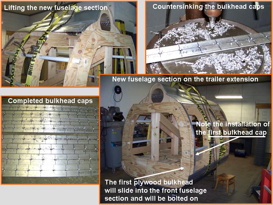 The pictures you see in Figure 5, cells 02 and 03, document the installation of the new fuselage section on the trailer extension and the attachment of the new fuselage section to the section in front of it. Cell 02 also shows the "manufacture" of the bulkhead caps that will serve to anchor the stringers and skin panels later. At this point, the new fuselage segment has been clamped in place on the trailer extension. The next step will be to finish bolting the support stubs to the bulkheads and then to weld those stubs to the trailer extension. The new trailer extension will also be welded to the main trailer. (You will see that part of the building process in Fuselage, Part 9.)