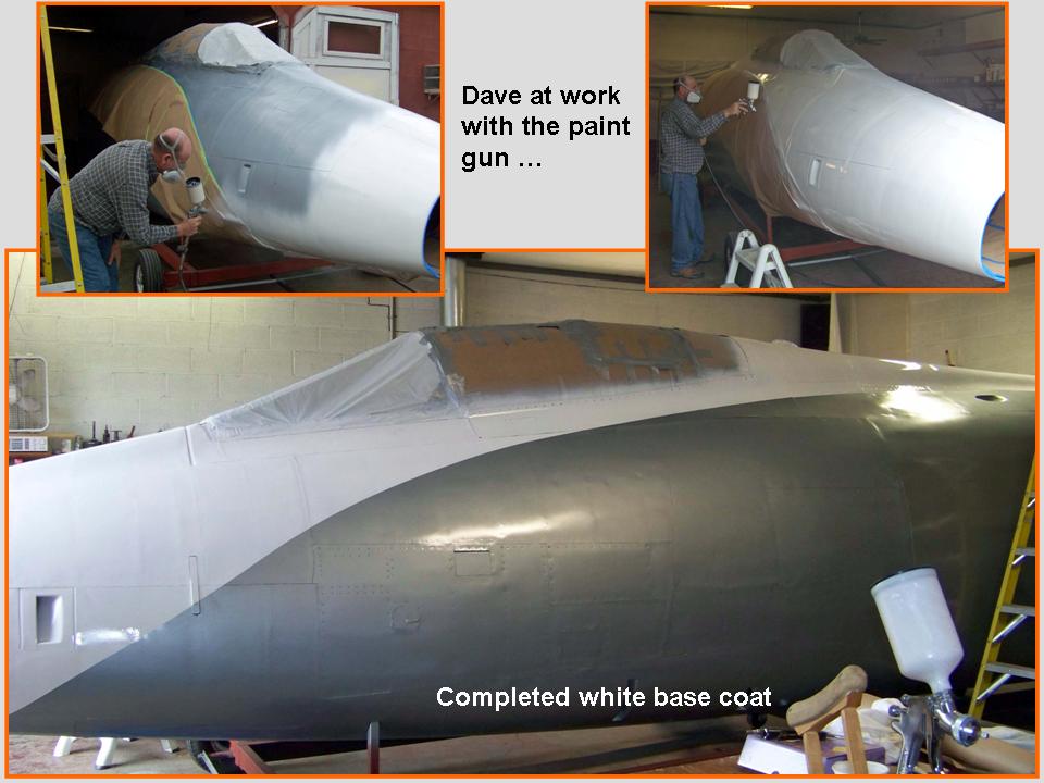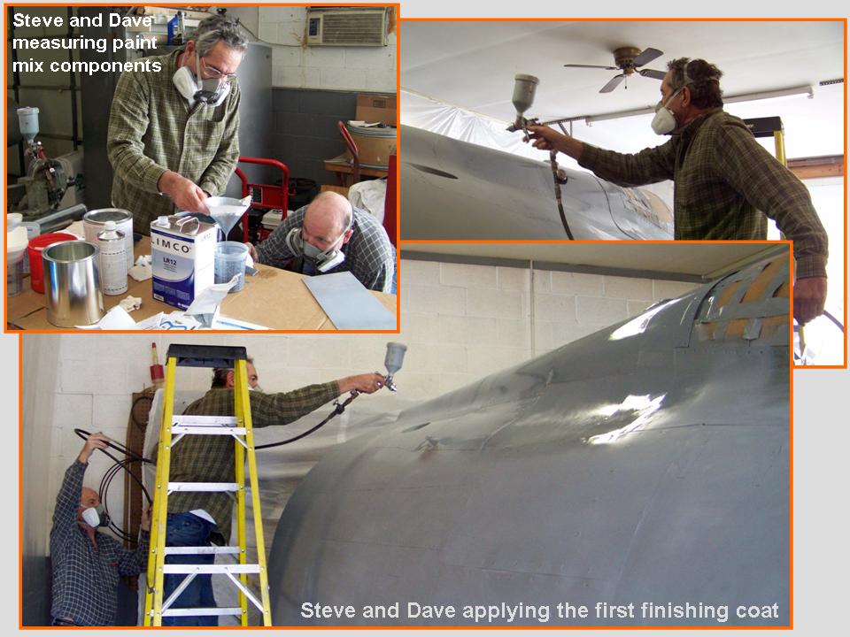 The composite picture in Figure 4, cell 02 shows the application of the white paint coat. Dave Graves and Steve Rettell are experienced painters, so their expertise eliminated guess work. Knowing how modern paints react under different temperature and humidity conditions is crucial, because such conditions define the paint mix with its hardener and reducer, as well as the spray gun nozzle opening and pressure. And then there's that knowledge of the precise nozzle distance from the surface to be painted and the rate at which the spray gun is moved. (I learned a lot about painting during this project!)