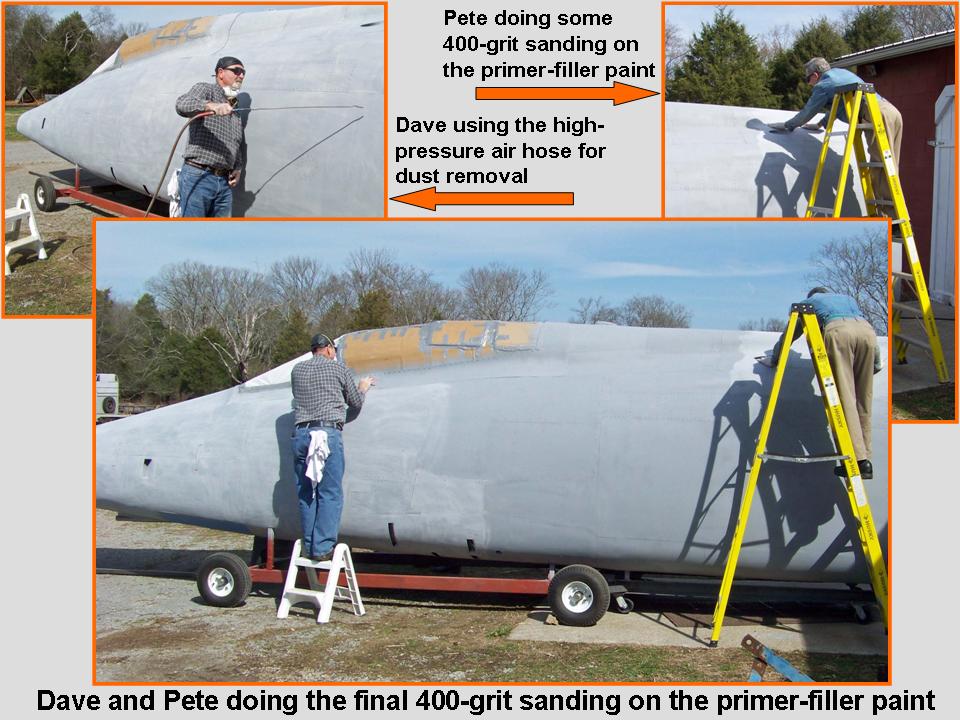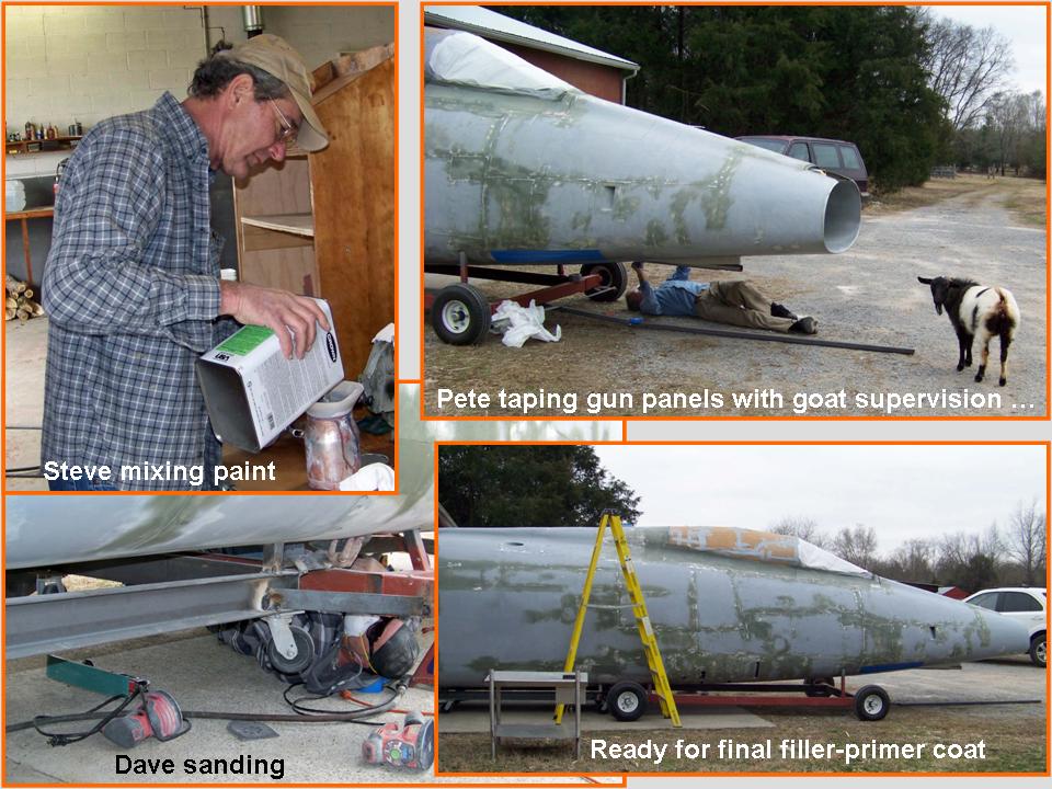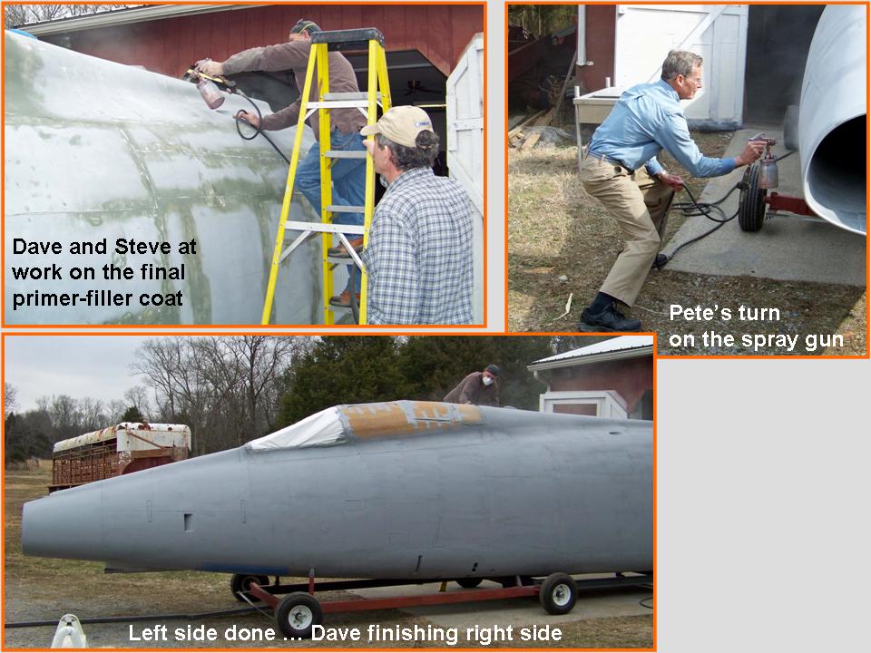 Figure 2, cell 03 shows the final primer-filler spraying. Five straight days, starting on 14 February, 2011, finally let us complete the primer-filler paint work. After that paint coat cures, one last sanding pass with 400-grit paper will get the fuselage segment ready for the color coats. (But we'll first have to build a large paint booth ... spraying the color coats requires a lot more control over the temperature and the dust.)