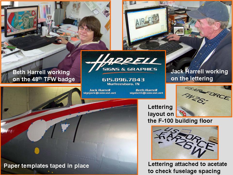The most important two pictures in Figure 6, cell 01, are the ones in the upper left and right corners. Jack and Beth Harrell are the owners of Harrell Signs and Graphics, which produces stunningly gorgeous graphics arts designs. (Their business card is shown in the center of the composite picture.) Steve introduced me to Jack and Beth Harrell after I told him that I intended to tape and paint the letters and -- with Anne's help! -- the 48th TFW wing badge. After seeing some of the Harrell work on cars, trucks, and buildings, I was easily convinced that Jack and Beth would do absolutely flawless work while saving me a lot of time and aggravation. (You'll see the results of the Harrell magic later ...)