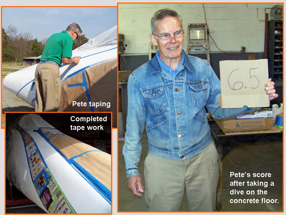 Figure 4, cell 3 shows what happens if you don't watch out where you're going. As I moved around the fuselage segment to check the tape adhesion, I didn't see the trailer wheel ... and managed to take a dive to the concrete. Steve and Dave were concerned that this senior citizen might have been damaged enough to require medical care and it took all my persuasive power to convince them that I was just fine. After the blood had been cleared off the floor and the bleeding had stopped -- and my face had been cleaned up -- Steve took a piece of cardboard on which he had written the number 6.5. He then requested that I hold up the sign so that he could take a picture ... then insisted that this picture HAD to be put on a web page. So here it is. (That 6.5 was my concrete dive score. Dave and I thought that, given the amount of blood I spilled, the score should have been at least an 8.5 -- but Steve is a tough grader ...)