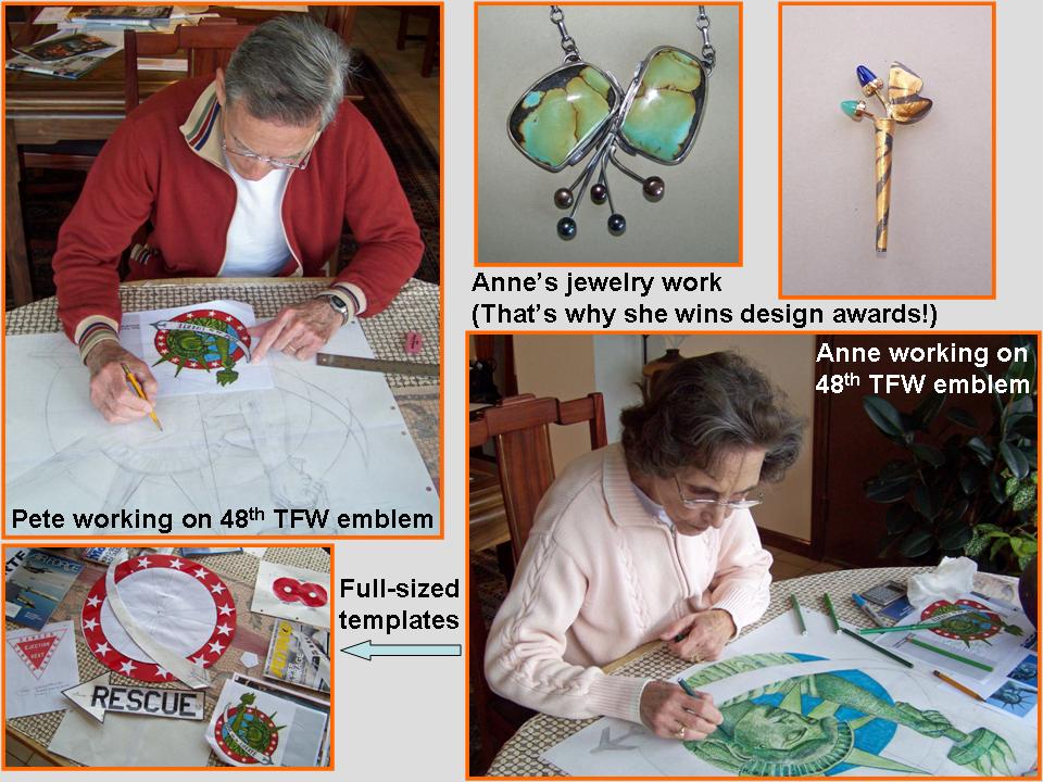 In the meantime, I continued working on the badge and letter templates at home. Sketching the outlines of the Statue of Liberty head and arm was something I could manage ... but getting the shadows and dress folds right would take a real artist. Fortunately, I married such an artist 49+ years ago. Anne honed her talents at the Royal Academy of Fine Arts in the Hague, Netherlands, in the 1950s -- and she perfected her superb skills during the decades that followed. She can do it all ... whether it involves painting or making furniture. During the 1970s and 80s, she learned how to make jewelry ... and she has taken many university courses since to enhance her skills. (The sketches she makes of proposed designs are works of art in themselves.) Figure 5, cell 02, shows Anne at work ... and it showcases just two of her jewelry pieces.