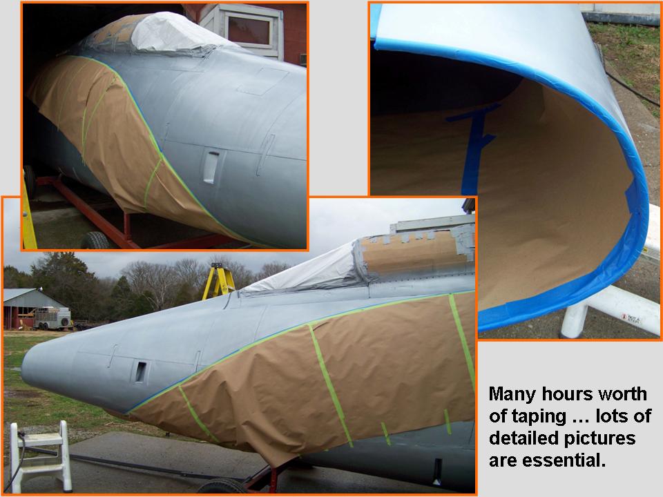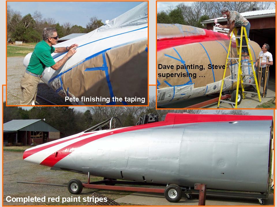 It's truly amazing how much time it takes to tape a design for a paint job. I had anticipated that I could complete the taping to delineate the red portions of the paint scheme in just a few hours. Instead, I spent well over 11 hours, spread across three days, to get the precise tape placement that I wanted. (And that does not include the hours spent looking at pictures and making multiple measurements.) And after the tape was properly applied, it still required additional hours to tape the paper over the areas that did not need red paint. (Fortunately, Dave and Steve managed to get the "papering" done, which was another roadblock on the way to the red paint work.) Finally, all the preparations were complete ... and then Dave and Steve mixed the red paint with the reducer and hardener to get the proper paint composition and consistency. The composite picture in Figure 5, cell 01, documents the process and the results.