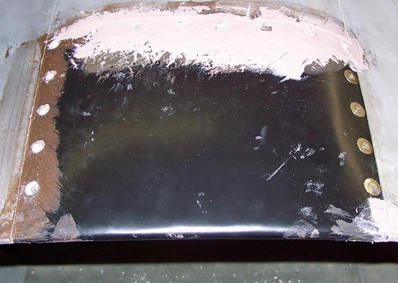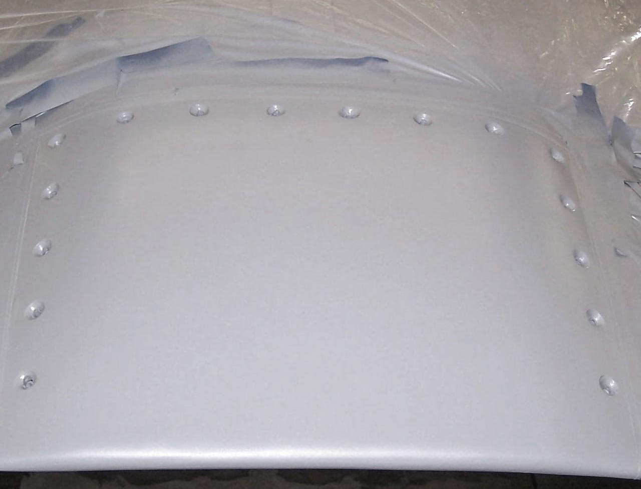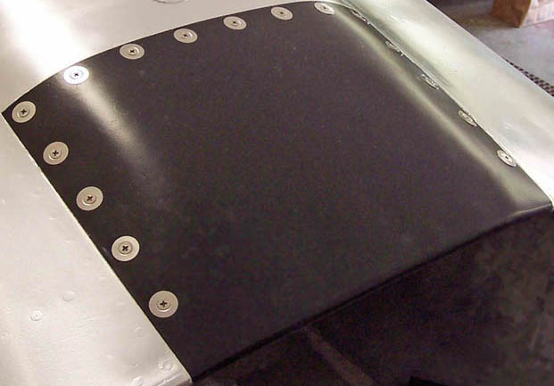 After the new gun radar cover had reached the stage you see in Figure 1, cell 3, I sprayed the gun radar cover with a semi-matte black finish. In the meantime, Steve Rettell had riveted the small back plates in place on the intake, so all I needed to do was to use the new screws and washers to fasten the gun radar cover to the intake. That's when I discovered that the fit was less than perfect ... In short, it was time for another session with Bondo and some fiberglass filler. (See Figure 2, cell 1.) Naturally, a lot more sanding followed. After the gun radar cover surface was sanded smooth again, a gray base paint was applied, followed by more sanding, the application of another coat of gray base paint, and more sanding. (See Figure 2, cell 2.)