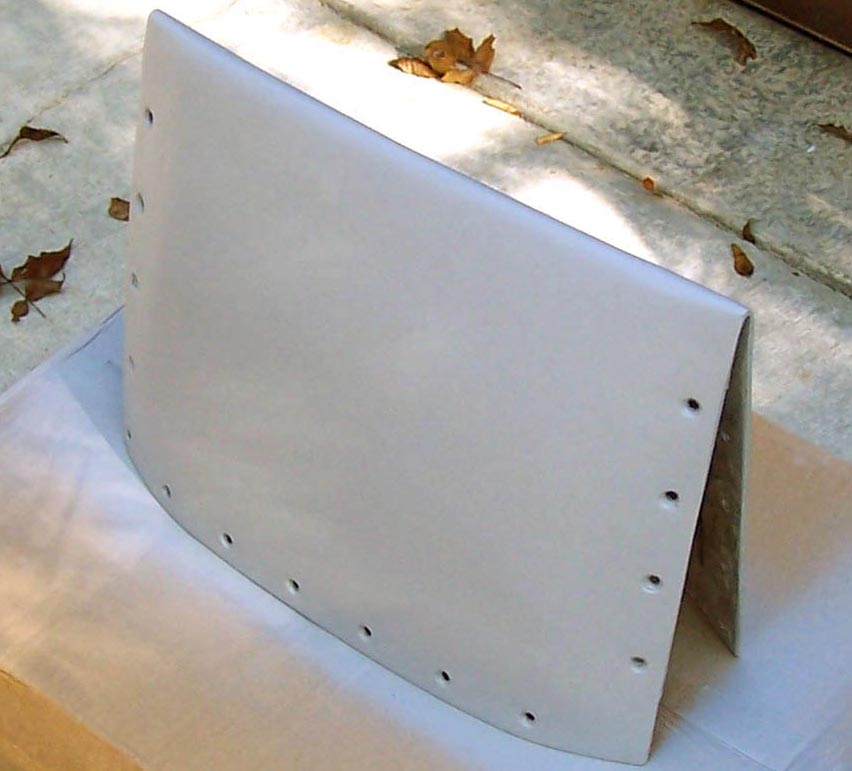 After the fiberglass had cured for a day, I pried it off the cast. (Fortunately, Steve Rettell had taught me that I had better cover the cast with lots of wax if I expected to pry the fiberglass off!) The fiberglass was then reinforced on the inside and more fiberglass layers were added to get the proper thickness ... that is, one that matched the original pieces of the gun radar cover. After the new layers of fiberglass were properly cured, I used Bondo to smooth the surface. When the Bondo had dried, more sanding was in order and then several coats of filler paint were applied, followed by more sanding. Next, the holes for the screws were drilled to match the screw holes in the intake. Two more filler coats and more sanding followed -- see Figure 1, cell 1.